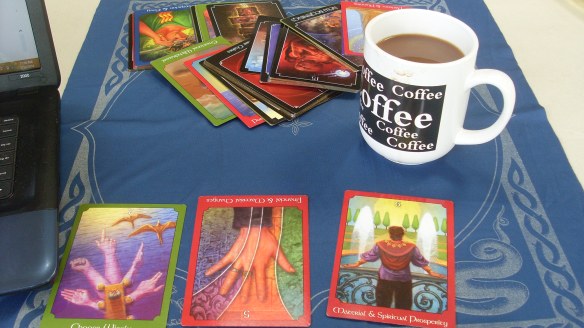 Greetings, This is actually Saturday morning (Memorial Day Weekend), as I write this.; and I sit now on the back porch, big old coffee mug beside me; lawn mowers humming in the background, tarot cards on the table beside me. I’m going to do one of my favorite things to do with tarot– I’m going to pull a set of triplicates. I’m just letting the universe speak to me. It might have something to say to me personally, or it might be tapping me on the shoulder with a message for someone else. I never know.